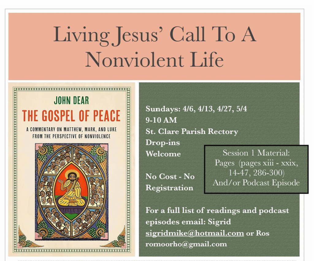The Saint Clare Peace and Justice Group invites you to a learning experience of 4 sessions bridging Lent and Easter as we explore Jesus’ ministry and Passion through the lens of non-violence.